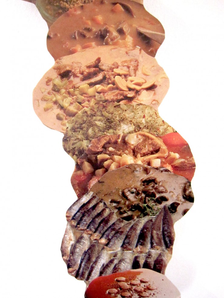 Selaillessani vanhoja keittokirjoja, huomasin katsovani yhä uudestaan ja uudestaan samaa kuvaa. Huolimatta siitä, että käänsin sivuja eteenpäin. Vihreää, ruskeaa, harmaata. Jotain survottuna jonkun sisälle, tai ainakin osittain peitossa. Kiiltäviä lihapintoja, sakeita sooseja ja ruoan valmistuksen aikana tunnistamattomaksi muuttuneita aineksia. Eri nimiset ruoat, ja ohjeiltaan eri ainesyhdistelmät – silti annos pysyy ulkonäöltään lähes samana.